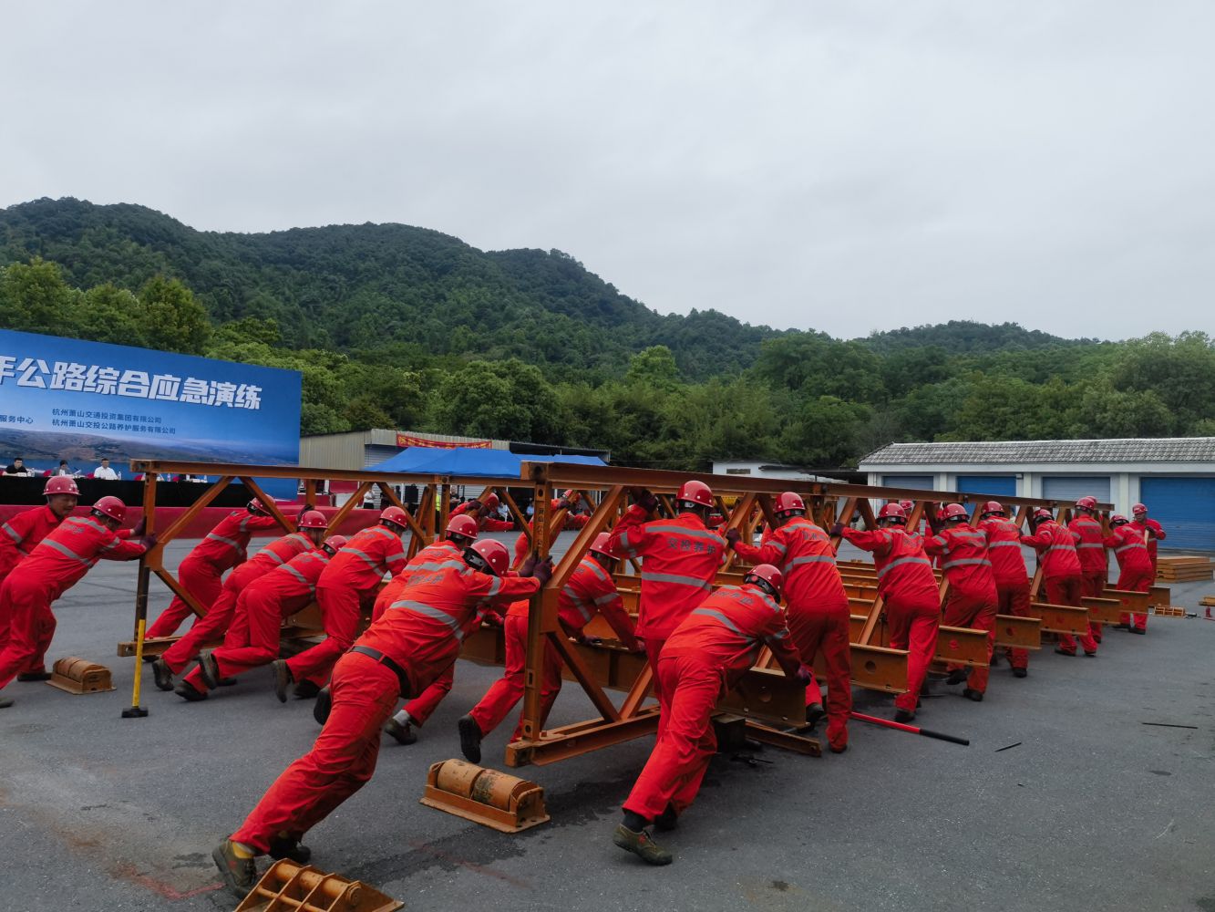 演練首先模擬了鋼橋受損的緊急情況。面對突如其來的險情,各參演隊伍迅速集結(jié)、密切配合,采取現(xiàn)場架設(shè)一座跨徑15米的321型裝配式公路鋼橋的方式,開展突發(fā)事件應(yīng)急處置。“立桁架、豎支撐、架橫梁、鋪設(shè)面板、推橋、落橋”搶險過程分工明確、技術(shù)嫻熟、配合默契,在短時間內(nèi)完成了鋼橋的臨時搭建工作,確保了交通的暢通無阻。