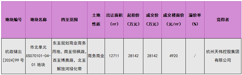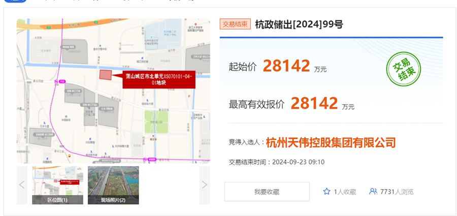 9月23日,由蕭山交投集團聯(lián)合蕭山經(jīng)濟技術開發(fā)區(qū)管委會招商做地的杭政儲出[2024]99號(蕭山城區(qū)市北單元XS070101-04-01地塊)總部企業(yè)項目地塊順利完成出讓!由杭州天偉控股集團有限公司以總價28142萬元的價格競得。