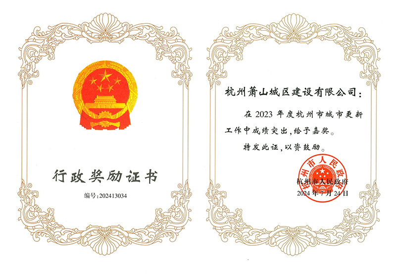 2024年7月 城區建設公司獲杭州市城市更新工作集體嘉獎