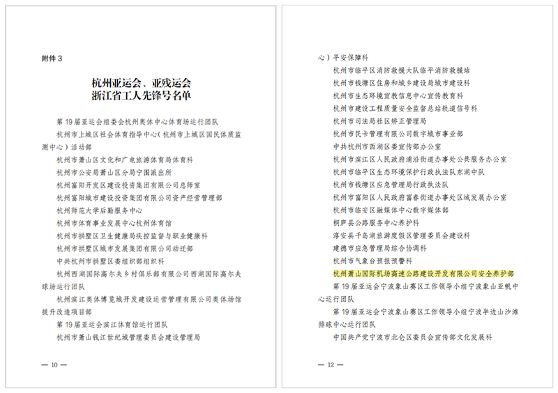2024年1月 集團下屬機場高速公司安全養護部榮獲“杭州亞運會、亞殘運會浙江省工人先鋒號”稱號